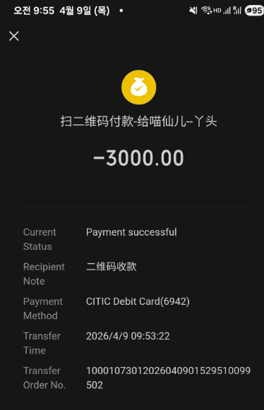 알리페이 송금/내가 보내야 할 금액:3000위안(1)